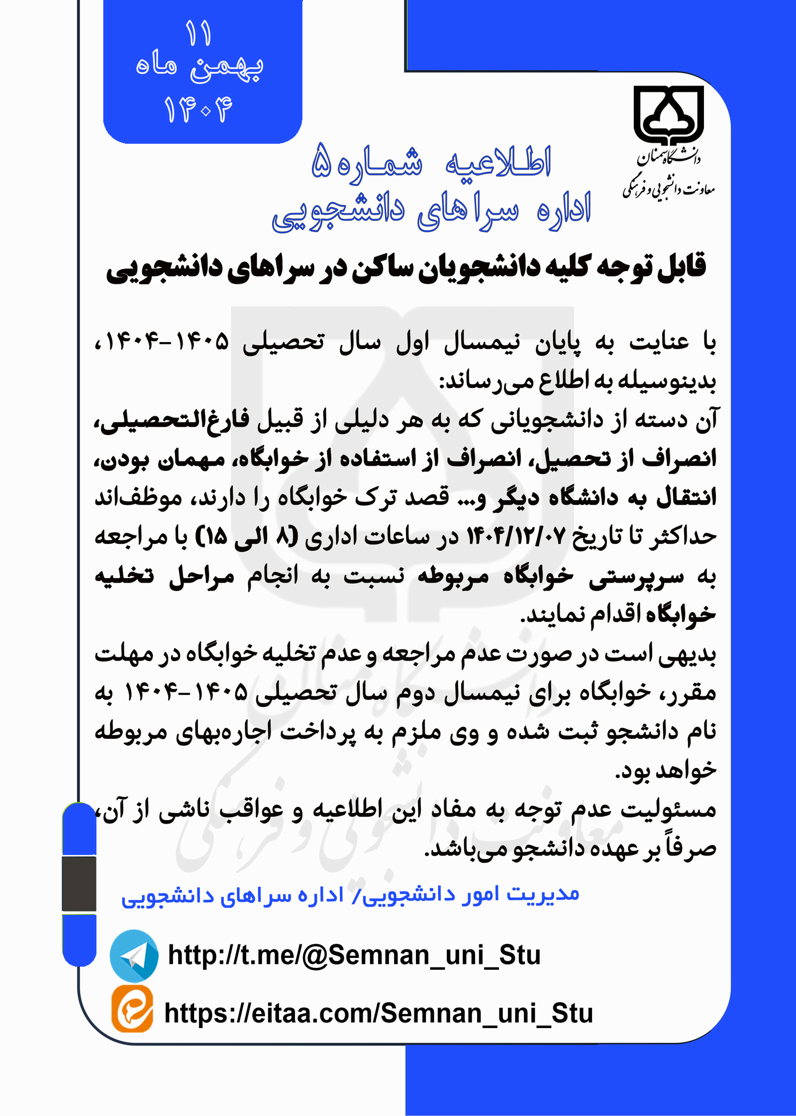 اطلاعیه شماره 5 اداره سراهای دانشجویی سال تحصیلی 1405-1404 1404/11/11 - 08:45 تعداد بازدید: 42 انجام مراحل تخلیه خوابگاههای دانشجویی ویژه دانشجویان ساکن سراها کلمات کلیدی
