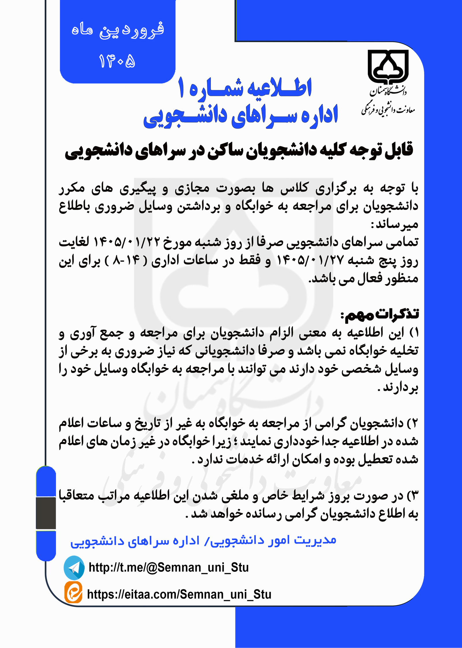 اطلاعیه شماره ۱ اداره سراهای دانشجویی فروردین ۱۴۰۵ 1405/02/05 - 11:47 تعداد بازدید: 24 ویژه دانشجویان ساکن در سراهای دانشجویی کلمات کلیدی