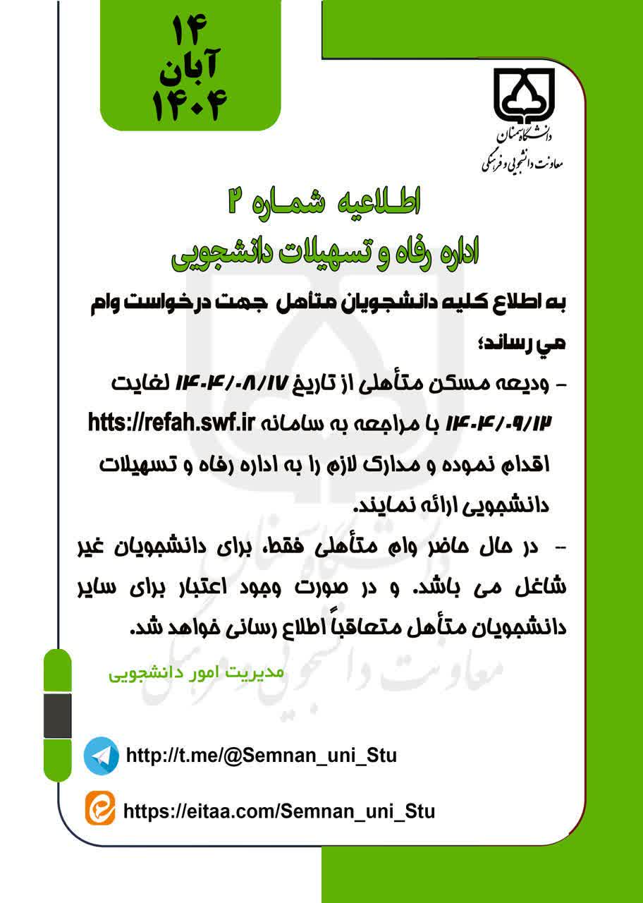 اطلاعیه شماره ۲ اداره رفاه و تسهیلات نیمسال اول سال تحصیلی 1405-1404 1404/08/16 - 16:03 تعداد بازدید: 99 قابل توجه دانشجویان متاهل متقاضی در خواست وام ودیعه مسکن کلمات کلیدی