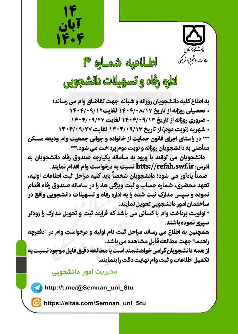 اطلاعیه شماره ۳ اداره رفاه و تسهیلات نیمسال اول سال تحصیلی 1405-1404 1404/08/16 - 16:13 تعداد بازدید: 133 قابل توجه کلیه دانشجویان روزانه و شبانه متقاضی وام صندوق رفاه کلمات کلیدی