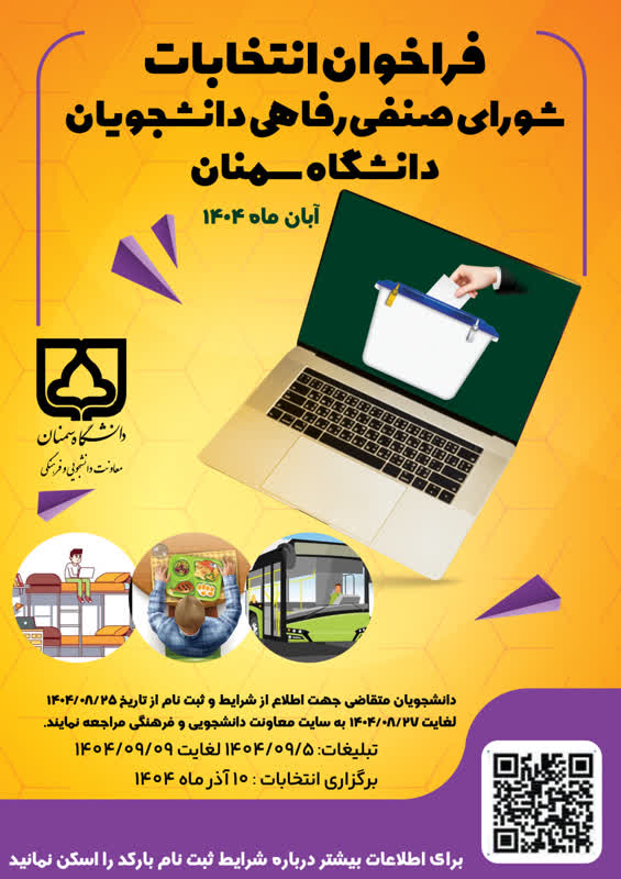 آغاز ثبت نام انتخابات شورای صنفی- رفاهی دانشجویان آبان ماه سال 1404 1404/08/25 - 09:44 تعداد بازدید: 33 لینک دریافت فرم ثبت نام داوطلبان کلمات کلیدی