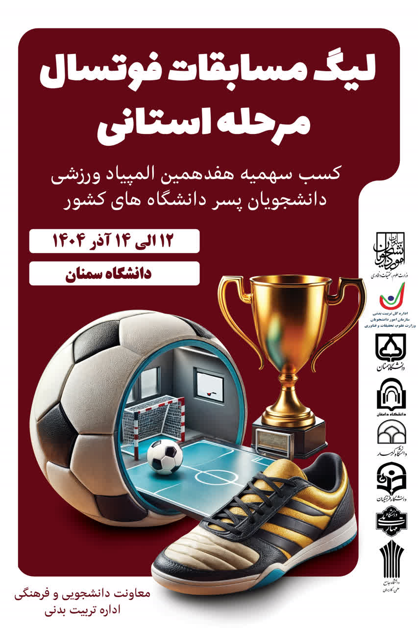لیگ مسابقات فوتسال مرحله استانی دانشگاههای کشور از ۱۲ تا ۱۴ آذر به میزبانی دانشگاه سمنان برگزار می شود .