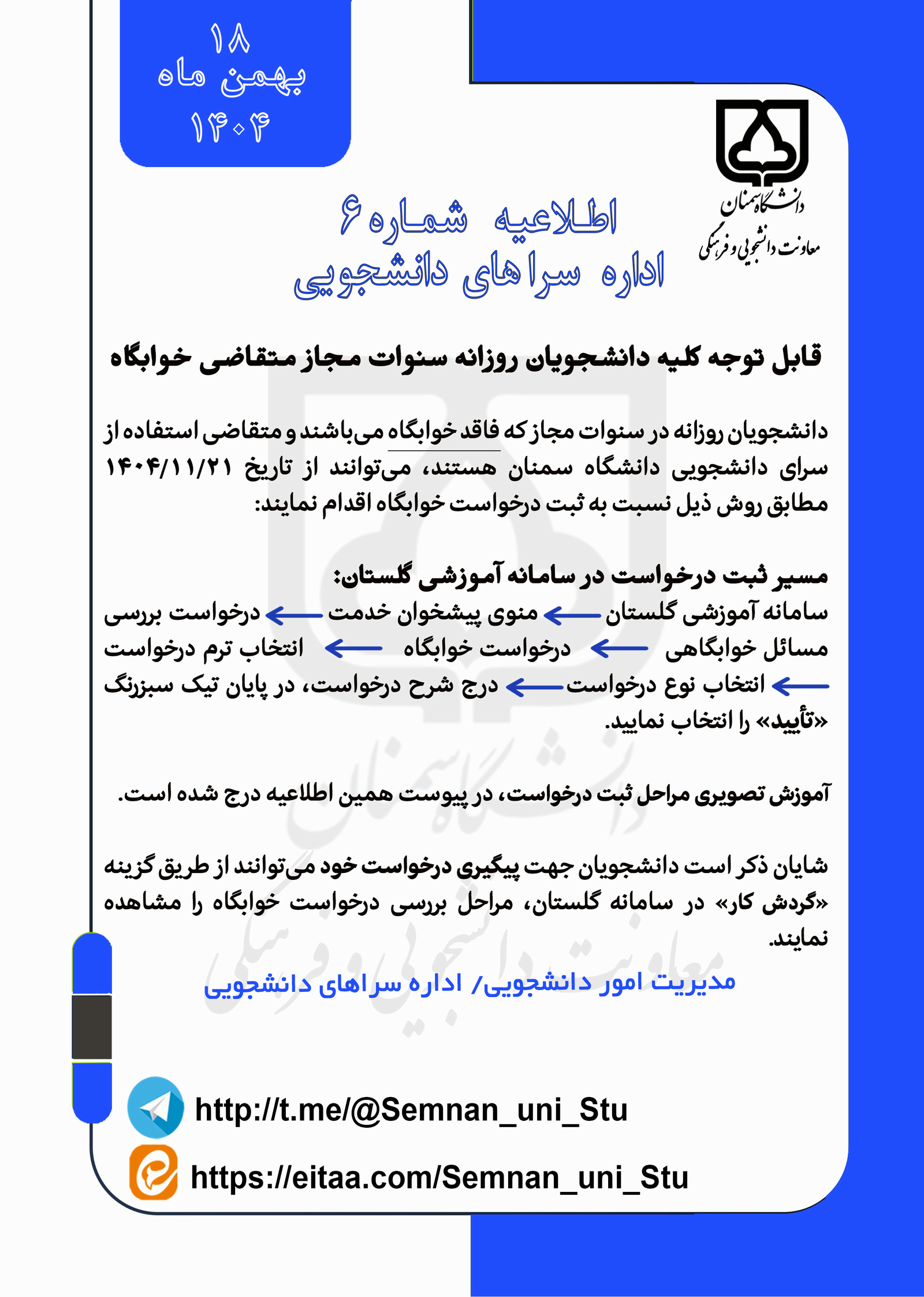 اطلاعیه شماره 6 اداره سراهای دانشجویی سال تحصیلی 1405-1404 1404/11/18 - 10:40 تعداد بازدید: 63 ویژه دانشجویان روزانه فاقد خوابگاه متقاضی سرای دانشجویی کلمات کلیدی