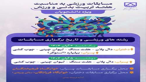 اداره تربیت بدنی دانشگاه به مناسبت هفته تربیت بدنی و ورزش در نظر دارد؛ جشنواره پائیزه ویژه دانشجویان محترم را برگزار نماید.